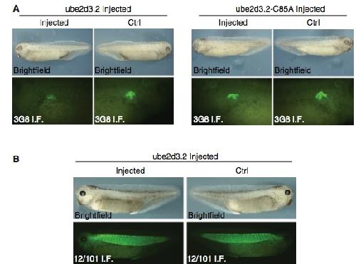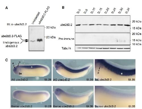Fig. 2 Embryonic expression of ube2d3.2. (now called ube2d4) (A) A polyclonal antibody raised to amino acids 1â147 of ube2d3.2 was used to probe control embryos (uninjected) and embryos expressing FLAG-tagged ube2d3.2(-FLAG). (B) Equal quantities of total embryonic protein