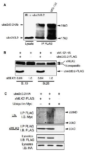 The Jun N-terminal kinase kinase kinase MLK2 is required for the formation of the pronephros during early Xenopus development. Here, we have used a yeast 2-hybrid screen to identify proteins that interact with and regulate xMLK2. Using an N-terminal polypeptide encompassing the SH3 and kinase domains of xMLK2 as bait, five independent cDNAs were identified, all of which encoded a Xenopus ubiquitin conjugating enzyme, ube2d3.2. Ube2d3.2 is a functional E2 enzyme expressed maternally and in a tissue-restricted fashion during development. Ectopic expression of ube2d3.2 inhibits formation of the pronephric tubules, resulting in a phenotype very similar to the loss of xMLK2 function. Because ube2d3.2 is also shown to limit accumulation of xMLK2, it is likely that this effect is direct, although other explanations are possible. Ube2d3.2 is thus probably an endogenous regulator of xMLK2, and hence of JNK activity.