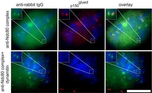 Fig. 2. Dynein/dynactin localization in cells injected with antibody to Ndc80 complex antibody and dynamitin. Cells were pretreated with MG132 (25 μM) to block mitotic exit. After injection, all cells were treated with nocodazole (50 ng/ml) for 10 min to disassemble the microtubules and enhance dynein/dynactin association with the kinetochores. The cell in the top row was injected with anti-Ndc80 complex antibodies. The cell in the bottom row was coinjected with anti-Ndc80 complex antibodies and dynamitin. Cells were labeled with anti-rabbit IgG (green) to detect the injected antibody. Cells also were labeled with mouse monoclonal antibody to the p150Glued subunit of dynactin complex (red). Chromosomes labeled with Dapi are depicted in blue in the merged image. In cells injected with only the anti-Ndc80 complex antibodies, p150Glued was found concentrated at kinetochore foci adjacent to the injected antibody signals. Coinjection of dynamitin caused loss of p150Glued concentration at kinetochores. Insets show enlarged views of selected kinetochore regions. Bar = 10 μm