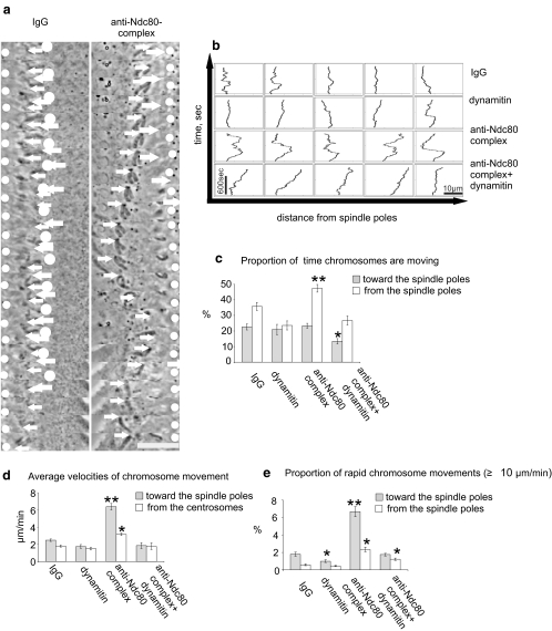 Fig. 3. Chromosomes in prometaphase cells with unseparated spindle poles exhibit distinct modes of movement dependent on dynein/dynactin and the Ndc80 complex. All cells were pretreated with monastrol (35 μM) to prevent spindle pole separation and with MG132 (25 μM) to block premature mitotic exit. a Tracking of chromosomal movements (40–45-s frame intervals). White circles indicate position of the spindle poles, and white arrows indicate position of the kinetochore of a single example chromosome. For each type of injection, the movements of 29 chromosomes were quantified within five to seven injected cells. In a control cell injected with rabbit IgG (left column), the analyzed chromosome exhibits moderate oscillation near the spindle pole. In a cell injected with antibodies to Ndc80 complex (right column), the chromosome undergoes exaggerated movement toward and away from the spindle poles. Bar = 10 μm. b Plots showing the effects of inhibition of dynein/dynactin and the Ndc80 complex in several examples of individual chromosome movements in Xenopus S3 cells. Compared to IgG-injected control cells (first row), chromosomes in cells injected with dynamitin protein (second row) showed little change in overall behavior. Chromosomes in cells injected with antibodies to the Ndc80 complex (third row) exhibited greatly exaggerated movements toward and away from the spindle pole. In cells injected with both dynamitin protein and with antibodies to the Ndc80 complex, the large excursions were suppressed. Instead, most chromosomes eventually drifted away from the spindle pole. Vertical scale bar = 600 s. Horizontal scale bar = 10 μm. c Percent of total time (mean ± sem) the chromosomes spent moving toward or away from the spindle poles. Inhibition of Ndc80 complex increased the proportion of time the chromosomes spend moving away from the spindle poles indicating a loss of stable kinetochore/microtubule attachment. Simultaneous inhibition of dynein/dynactin and the Ndc80 complex and dynein diminished the increase of chromosome movement found upon inhibition of Ndc80 complex alone. d Average velocities of chromosome movement in the injected cells. Chromosomes in cells injected with anti-Ndc80 complex antibodies exhibited a significant increase in the average velocities toward the spindle pole (p < 0.001, n = 29). Cells were observed for 15 min after injection. e Percent of total time (mean ± sem) the chromosomes move rapidly (≥10 μm/min) toward and away from the spindle poles. Inhibition of dynein/dynactin led to a 50% decrease in rapid poleward movements compared with control (p < 0.05). Inhibition of Ndc80 complex led to a significant increase in rapid chromosome movements (p < 0.001). Simultaneous inhibition of Ndc80 complex and dynein/dynactin diminished these rapid movements. Movies showing chromosome behavior in injected cells are available as Movies 1, 2, 3, and 4. Compared with controls, asterisk indicates p < 0.05, and double asterisk indicates p < 0.001