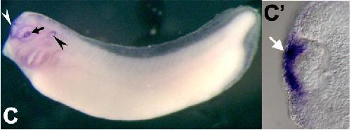 foxe3 (forkhead box E3) gene expression in X. tropicalis embryo, NF stage 23, assayed via in situ hybrodization, lateral view (left) and anterior view (right), dorsal up. |