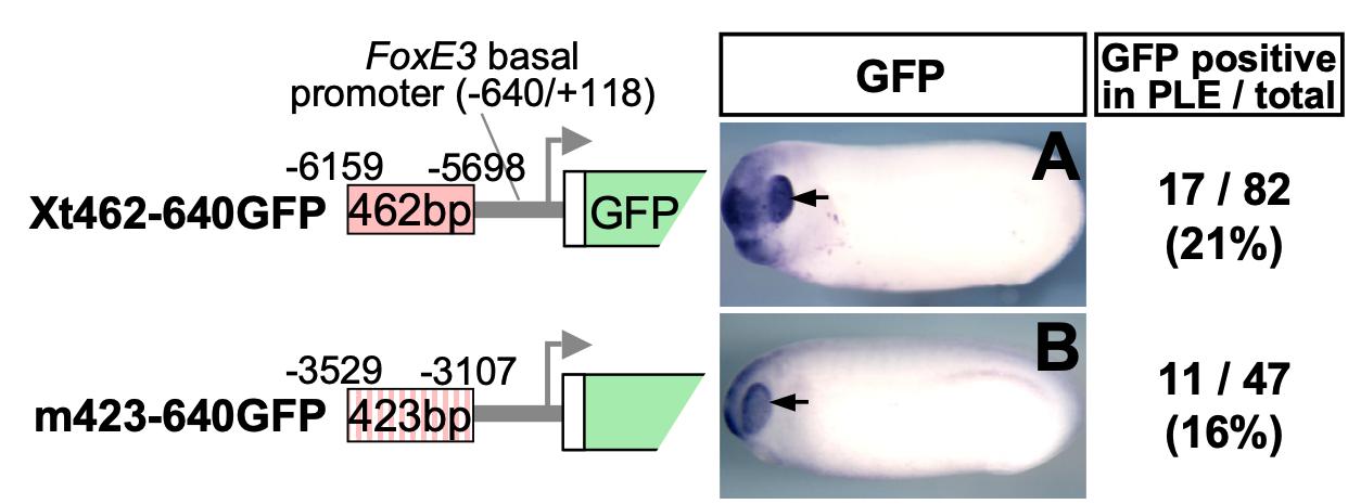 Supplemental Figure S2 (Adobe PDF) Fig. S2. The 462 bp enhancer of Xenopus FoxE3 and the orthologous mouse element drive indistinguishable PLE-specific expression in Xenopus embryos. (A) A representative transgenic embryo (stage 24) generated with a GFP reporter construct where the 462 bp Xenopus enhancer is directly linked to the FoxE3 basal promoter (−640 promoter used in Fig. 1E). (B) A representative transgenic embryo (stage 24) generated with a GFP reporter construct where the orthologous mouse element (423 bp) is directly linked to the FoxE3 basal promoter. Black arrows indicate GFP expression in the PLE detected by in situ hybridization. Numbers of embryos with GFP expression in the PLE and the total number of normally (or near normally) developing embryos injected with the constructs shown on the left are indicated on the right side with percentages of the GFP-positive cases. |