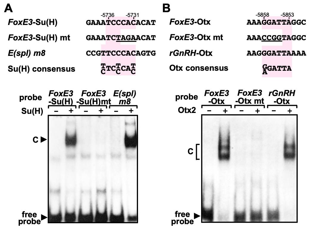 Supplemental Figure S3 (Adobe PDF) Fig. S3. Gel retardation assay showing in vitro binding of Su(H) and Otx2 proteins to the FoxE3 enhancer. The actual probe length was 33 bp, but only sequences around the Su(H) or Otx motif are shown at the top. (A) Labeled probe DNAs were incubated with either glutathione S-transferase (GST, indicated as −) or Xenopus Su(H) protein fused to GST (indicated as +) (Wettstein et al., 1997). A DNA-protein complex (c) was formed with a probe containing the putative Su(H) motif of the FoxE3 enhancer probe FoxE3-Su(H), as well as with a probe containing the previously identified high-affinity Su(H) site of the m8 gene in the Drosophila Enhancer of split cluster probe E(spl) m8 (Tun et al., 1994). The complex was not formed with a mutated FoxE3 probe whose Su(H) site has the same four-base substitution probe FoxE3-Su(H) mt, mutated sequences are underlined as the mutant reporter construct used in the transgenic assay (Fig. 3D, mt7). The m8 probe and Su(H) consensus sequences shown here are the reverse strands of those originally reported (Tun et al., 1994). (B) Labeled probe DNAs were incubated with either the rabbit reticulocyte lysate (TNT Quick Coupled Transcription/Translation System, Promega) programmed with an empty vector (pCS2+) (Turner and Weintraub, 1994) (indicated as −) or that programmed with Xenopus Otx2 expression vector (pCS2+XOtx2; indicated as +). The Otx2 protein formed two shifted complexes (c) with a probe containing the 3′ Otx motif of the FoxE3 enhancer (probe FoxE3-Otx), as well as with a probe containing the previously identified Otx2-binding site of rat gonadotropin-releasing hormone (rGnRH) gene (probe rGnRH-Otx) (Kelley et al., 2000). The shifted complexes were not formed with a mutated FoxE3 probe whose Otx site has the same four-base substitution (probe FoxE3-Otx mt, mutated sequences are underlined) as the mutant reporter construct used in the transgenic assay (Fig. 3D, mt5). The two shifted bands observed are likely to be due to the monomeric and dimeric DNA-binding activity of Otx2 (Briata et al., 1999). Briata, P., Ilengo, C., Bobola, N. and Corte, G. (1999). Binding properties of the human homeodomain protein OTX2 to a DNA target sequence. FEBS Lett.445, 160-164. Kelley, C. G., Lavorgna, G., Clark, M. E., Boncinelli, E. and Mellon, P. L. (2000). The Otx2 homeoprotein regulates expression from the gonadotropin-releasing hormone proximal promoter. Mol. Endocrinol.14, 1246-1256. Turner, D. L. and Weintraub, H. (1994). Expression of achaete-scute homolog 3 in Xenopus embryos converts ectodermal cells to a neural fate. Genes Dev.8, 1434-1447. Wettstein, D. A., Turner, D. L. and Kintner, C. (1997). The Xenopus homolog of Drosophila Suppressor of Hairless mediates Notch signaling during primary neurogenesis. Development124, 693-702. |