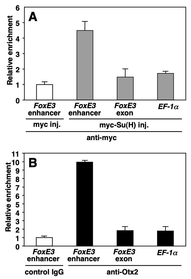 Supplemental Figure S4 (Adobe PDF) Fig. S4. Chromatin immunoprecipitation (ChIP) assay showing in vivo binding of Su(H) and Otx2 to FoxE3 enhancer. (A) Sheared crosslinked chromatin was prepared from stage 22-24 embryos injected with mRNA encoding either myc-Su(H) (Wettstein et al., 1997) (200 pg per embryo) or myc-tag alone, and immunoprecipitated with 5 µg of anti-myc antibody (Santa Cruz, sc-40). The FoxE3 enhancer is enriched approximately 4.5-fold in the chromatin sample prepared from embryos expressing myc-Su(H) as compared with the sample from embryos expressing myc-tag alone, whereas exon sequences of FoxE3 and EF-1α are not siginificantly enriched. Consistent with this result, anti-human Su(H)/RBP-Jκ antibody (Santa Cruz, sc-8213), which weakly binds to native Xenopus Su(H) protein, enriched the FoxE3 enhancer in chromatin samples prepared from uninjected embryos, although the enrichment level was lower (1.8-fold compared with control IgG, not shown). (B) Chromatin samples were prepared from heads of uninjected stage 22-24 embryos, and imunoprecipitated with either 5 µg of control IgG or anti-Otx2 antibody (Abcam, ab21990). The strong reactivity of this anti-Otx2 antibody to Xenopus Otx2 protein was confirmed by western blotting (not shown). The FoxE3 enhancer is enriched approximately 10-fold in the anti-Otx2 chromatin sample compared with the sample treated with control IgG, whereas the exon sequences of FoxE3 and EF-1α are not siginificantly enriched. In A and B, the size of the sheared chromatin was 200-1000 bp (not shown), and the EZ ChIP Kit (Upstate Biotechnology) was used with some modifications (our detailed protocol is available upon request). Relative enrichment of imunoprecipitated DNA sequences was analyzed by real-time PCR (MyiQ system, Bio-Rad) using a dilution series of the input chromatin as standard curve templates, and means of three independent experiments are shown with standard errors. The primers used were as follows: for FoxE3 enhancer, 5′- AGGTTTAAGGGTGACCTGCTC-3′ and 5′-TGTGTGGGATTTCTGCAGTC-3′; for FoxE3 exon, 5′-TGAATGGGAACCTAGGGAAC-3′ and 5′-AGGTTAGGTTGGAAGACACAGC-3′; for EF-1α exon, 5′-ATGCACCATGAAGCCCTTAC-3′ and 5′- CTTCCATTGGTGGGTCATTC-3′. These primers were designed for X. laevis DNA sequences. X. laevis FoxE3 enhancer sequence has 95% identity with the X. tropicalis sequence in Fig. 2B (not shown). |