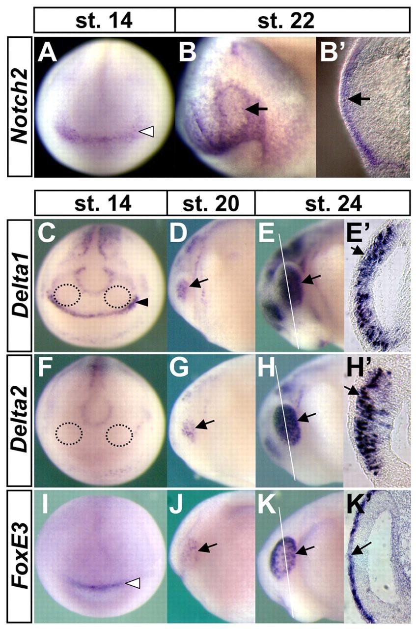 Fig. 4. Comparative expression analysis of Notch signaling components and FoxE3 in X. laevis embryos, showing that Notch2 and FoxE3 are expressed in PLE, while Delta1 and Delta2 are expressed in presumptive retina. Expression of Notch2 (A-Bâ²), Delta1 (C-Eâ²), Delta2 (F-Hâ²), and FoxE3 (I-Kâ²) was detected by in situ hybridization from neural plate stages to early tailbud stages. Regions circled with black dotted lines in C and F are the approximate presumptive retina fields, where neither Delta1 nor Delta2 is expressed. Arrows in B,Bâ², D-Eâ², G-Hâ² and J-Kâ² indicate expression of Notch2, Delta1, Delta2 and FoxE3, respectively. The black arrowhead in C indicates Delta1 expression in the anterior neural ridge, and white arrowheads in A and I indicate Notch2 and FoxE3 expression in the pre-placodal ectoderm, respectively. White lines in E,H,K indicate the planes of transverse eye sections shown in Eâ²,Hâ²,Kâ². |