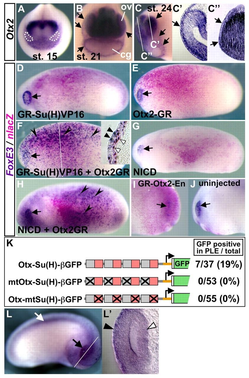 Fig. 6. Otx2 confers the ability to activate FoxE3 in response to Notch signaling. (A-Câ²) Expression of Otx2 in the anterior ectoderm detected by in situ hybridization. At the neural plate stages, Otx2 is expressed in the anterior ectoderm including the presumptive lens-fields, which are circled with white dotted lines in A. Arrows in B indicate broad expression in the ectoderm that overlies the optic vesicles (ov) and surrounds the cement gland primordium (cg). Arrows in C indicate the border of ectodermal Otx2 expression. White lines in C indicate the planes of transverse sections shown in Câ² and Câ². Arrows in Câ² and Câ², respectively, indicate expression in the PLE overlying the optic vesicle and in the ectoderm overlying the forebrain. (D-H) Notch-Otx2 combination activates FoxE3 in the trunk ectoderm. Xenopus embryos injected with the mRNAs indicated in each panel were induced with Dex, and then subjected to lacZ staining and in situ hybridization with FoxE3 probe. Ectopic FoxE3 expression was not detected in embryos injected with mRNA encoding GR-Su(H)VP16 (1000 pg) (D), Otx2-GR (250 pg) (E), or NICD (1000 pg) (G), whereas it was detected in embryos injected with both GR-Su(H)VP16 (750 pg) and Otx2-GR (250 pg) (F), or both NICD (750 pg) and Otx2-GR (250 pg) (H). Arrowheads in F and H indicate ectopic FoxE3 expression. Arrows indicate endogenous FoxE3 expression in the PLE. The white line in F indicates the plane of the transverse section shown in the inset. Black arrowheads in the inset indicate the overlap of FoxE3 expression and nuclear lacZ staining in the ectodermal cells, and white arrowheads indicate cells in the underlying mesoderm layer showing nuclear lacZ staining but no FoxE3 expression. (I,J) The injected and uninjected sides, respectively, of an embryo injected with mRNA encoding GR-Otx2-En (250 pg), induced with Dex from stage 18, and then subjected to lacZ staining and in situ hybridization with FoxE3 probe at stage 22. Arrows indicate the PLE. (K) Transgenic experiments using Otx-Su(H) reporter constructs. Numbers of embryos with GFP expression in the PLE and the total number of normally (or near normally) developing embryos injected with the constructs shown on the left are indicated on the right-hand side with percentages of the GFP-positive cases. Gray and red boxes indicate Otx- and Su(H)-binding motifs, respectively, in the constructs, and crosses indicate base-substitution mutations introduced there. (L,Lâ²) A representative transgenic embryo generated with Otx-Su(H)-βGFP. Black and white arrows indicate GFP expression in the eye and spinal cord, respectively. The white line indicates the plane of the transverse eye section shown in Lâ². Black and white arrowheads indicate GFP expression in the PLE and optic vesicle, respectively. |