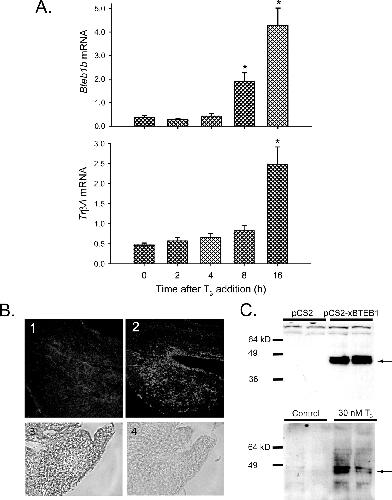 Thyroid hormone up-regulates Bteb1 mRNA in tadpolebrain with faster kinetics than TrβA mRNA. Increased Bteb1 mRNA correlates with elevated BTEB1 protein. A, up-regulation of Bteb1 (top) and TrβA (bottom) mRNAs in premetamorphic X. laevis tadpolebrain (NF stage 52) following exposure to T3 (10 nM) added to the aquarium water (n = 4/time point). Gene expression was analyzed by RTqPCR. Asterisks designate significant differences from the zero time point (p < 0.0001; Scheffe's test). B, treatment with T3 increases BTEB1 protein expression in X. laevis tadpolebrain. Panel 1, BTEB1 protein is expressed at a very low level in NF stage 52 tadpolebrain (optic tectum shown) but is increased dramatically by T3 treatment (panel 2;10 nM in aquarium water for 24 h). Panel 3, representative sagittal brain section (hypothalamic region) from an NF stage 52 tadpole treated with T3 in the aquarium water (10 nM; 24 h). Strong BTEB1 staining was restricted to cell nuclei. Panel 4, immunostaining for BTEB1 was eliminated by preabsorption with GST-xBTEB. BTEB1 immunoreactivity was detected by Cy3 immunofluorescence (panels 1 and 2) or by horseradish peroxidase staining (panels 3 and 4). C, Western blot analysis of xBTEB1 in protein extracts from pCS2 or pCS2-xBTEB1-transfected XTC-2 cells (upper panel); endogenous BTEB1 in protein extracts of XTC-2 cells were treated with or without T3 (30 nM) for 24 h (lower panel). This dose of T3 causes a maximal response in TrβA and Bteb1 mRNA (data not shown). Immunoblotting was conducted using affinity-purified IgG that recognizes the N-terminal region of xBTEB1 (see âExperimental Proceduresâ). Arrows point to the two BTEB1 bands.