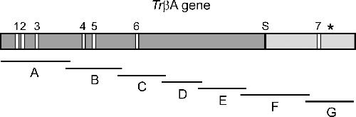 Schematic representation of the X. laevis TrβA gene with locations of GC boxes and regions analyzed by EMSA and ChIP assay. The bars with letters below indicate the general regions of the TrβA gene targeted for analysis by EMSA and in the ChIP assay and correspond to the specific sequences given in supplemental Table 1. The numbering of the seven GC boxes corresponds to that given in Table 4. The dark gray filled box represents the upstream region, the S indicates the transcription start site, the light gray filled box represents the 5′-UTR, and the asterisk indicates a TRE that has been characterized and proposed to mediate T3-dependent transactivation (40, 58).
