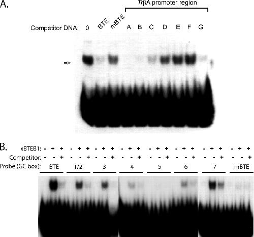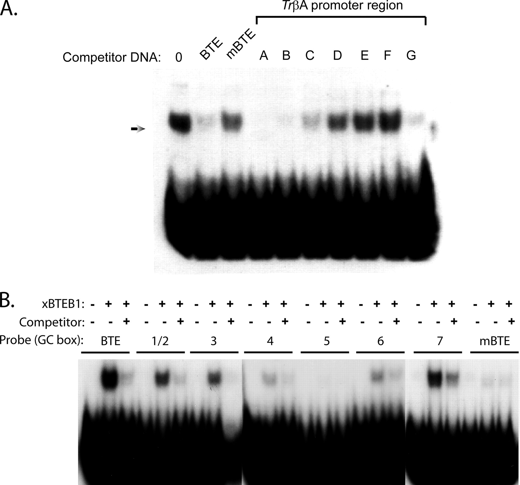 A, binding of GST-xBTEB1[DBD] to regions of the proximal X. laevis TrβA promoter in vitro. We used EMSA to test the ability of radioinert DNA fragments (1.89 μM/reaction) corresponding to different regions of the proximal TrβA promoter (generated by PCR; see Fig. 2 and supplemental Table 1) to displace GST-xBTEB1[DBD] binding to the 32P-BTE probe. mBTE, mutated BTE. B, binding of GST-xBTEB1[DBD] to GC-rich regions of the proximal TrβA promoter. We used EMSA to test whether GST-xBTEB1[DBD] could bind to short 32P-labeled oligonucleotides encompassing one or two GC boxes in the TrβA promoter. The numbering of the GC boxes included in each oligonucleotide probe is based on that given in Fig. 2 and Table 4. In each case homologous, radioinert competitors (1.89 μM) were used to displace binding.