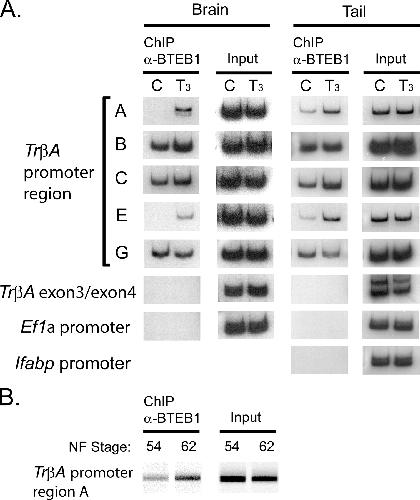 BTEB1 associates with the proximal TrβA promoter in vivo in a T3 and developmental stage-dependent manner. ChIP assay was conducted using an affinity-purified IgG directed against the N-terminal region of X. laevis BTEB1. A, T3-dependent association of BTEB1 with the proximal TrβA promoter in tadpolebrain and tail. Premetamorphic (NF stage 52) X. laevis tadpoles were treated with 10 nM T3 added to the aquarium water for 48 h prior to tissue collection for ChIP assay (see âExperimental Proceduresâ). The lettered TrβA promoter regions analyzed correspond to those given in Fig. 2 and supplemental Table 1. The TrβA exon 3/exon 4, and the Efα1 and Ifabp promoters were used as negative controls. B, developmental stage-dependent association of BTEB1 with the proximal TrβA promoter in early prometamorphic (NF stage 54) and climax stage (NF stage 62) X. laevis tadpolebrain. Only region A of TrβA promoter, which showed robust T3-dependent association of BTEB1 was targeted for ChIP analysis in this experiment. Each of the ChIP experiments was repeated three times with similar results.
