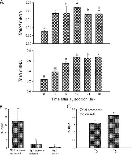???displayArticle.abstract??? Thyroid hormone (T(3)) induces gene regulation programs necessary for tadpole metamorphosis. Among the earliest responses to T(3) are the up-regulation of T(3) receptor beta (TRbeta; autoinduction) and BTEB1 (basic transcription element-binding protein 1). BTEB1 is a member of the Krüppel family of transcription factors that bind to GC-rich regions in gene promoters. The proximal promoter of the Xenopus laevis TrbetaA gene has seven GC-rich sequences, which led us to hypothesize that BTEB1 binds to and regulates TrbetaA. In tadpoles and the frog fibroblast-derived cell line XTC-2, T(3) up-regulated Bteb1 mRNA with faster kinetics than TrbetaA, and Bteb1 mRNA correlated with increased BTEB1 protein expression. BTEB1 bound to GC-rich sequences in the proximal TrbetaA promoter in vitro. By using chromatin immunoprecipitation assay, we show that BTEB1 associates with the TrbetaA promoter in vivo in a T(3) and developmental stage-dependent manner. Induced expression of BTEB1 in XTC-2 cells caused accelerated and enhanced autoinduction of the TrbetaA gene. This enhancement was lost in N-terminal truncated mutants of BTEB1. However, point mutations in the zinc fingers of BTEB1 that destroyed DNA binding did not alter the activity of the protein on TrbetaA autoinduction, suggesting that BTEB1 can function in this regard through protein-protein interactions. Our findings support the hypothesis that BTEB1 associates with the TrbetaA promoter in vivo and enhances autoinduction, but this action does not depend on its DNA binding activity. Cooperation among the protein products of immediate early genes may be a common mechanism for driving developmental signaling pathways.