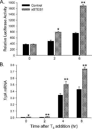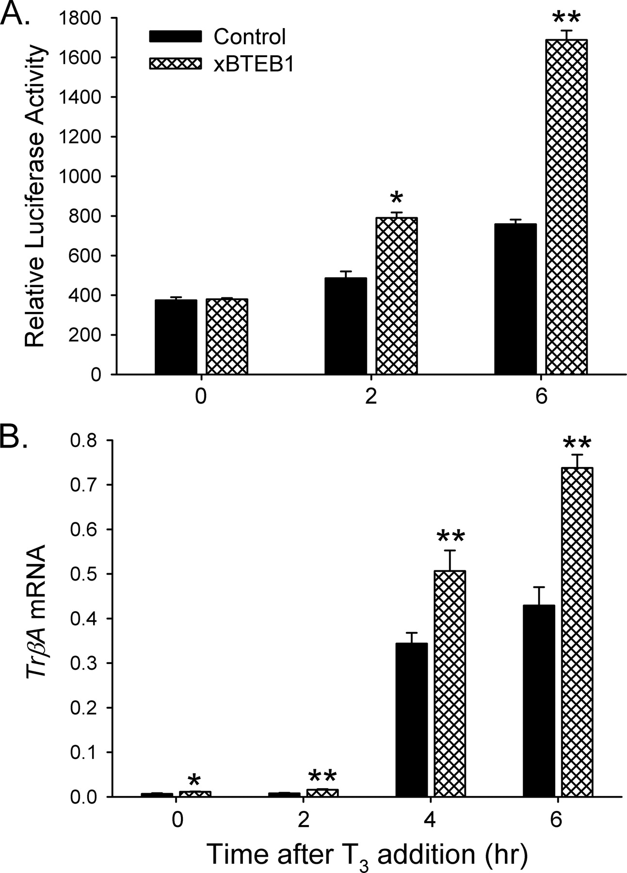 Expression of BTEB1 enhances TrβA autoinduction in XTC-2 cells. A, forced expression of BTEB1 accelerates and enhances autoinduction of the TrβA promoter. XTC-2 cells were cotransfected with the X. laevis TrβA promoter-luciferase plasmid, pCMV-xBTEB1, and pRenilla (to normalize for transfection efficiency using a dual reporter luciferase assay; see “Experimental Procedures”). Cells were treated with 5 nM T3 for 0, 2, or 6 h before harvest. Bars represent the mean ± S.E. The data shown are the means ± S.E. from one transfection experiment (n = 4/treatment group), and the experiment was repeated three times with similar results. The T3-dependent activation of the TrβA promoter was not altered by transfection with empty vector (pCMVneo; data not shown.) Asterisks denote significant differences from empty vector controls (*, p < 0.01; **, p < 0.001; Student's unpaired t test). B, forced expression of BTEB1 increases the expression of endogenous TrβA mRNA. XTC-2 cells were cotransfected with 1 μg of pCS2-xBTEB1 or pCS2 empty vector. Forty eight h after transfection the cells were treated with 5 nM T3 for 0, 2, 4, or 6 h before harvest. Gene expression analysis was done by RTqPCR. Data shown are the means ± S.E. from one transfection experiment (n = 6/treatment), and the experiment was repeated four times with similar results. Asterisks denote significant differences from empty vector controls (*, p < 0.05; **, p < 0.001; unpaired t test).