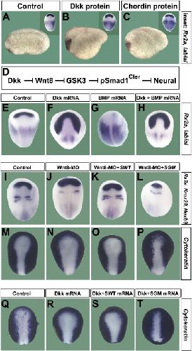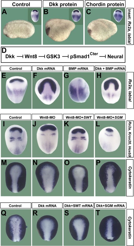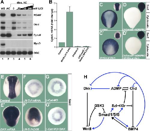 Figure 7. Wnt Signaling Induces Epidermis in a Smad1/5/8- and β-Catenin-Dependent, but Tcf3-Independent, Manner(A) LiCl induces epidermis (Cytokeratin) and inhibits neural differentiation (NCAM, Otx2). Radioactive RT-PCR analysis of whole embryos (WE), animal cap (AC) explants, and dissociated animal cap cells at stage 13. MyoD indicates lack of mesoderm induction and Ornithine decarboxylase (ODC) equal loading.(B) Quantitative PCR of dissociated animal caps injected with pCSKA-Wnt8 and pCS2-LRP6 DNA. DN-Smad5 mRNA was coinjected to block Smad1/5/8 activity. Cytokeratin mRNA levels at stage 13 were normalized for ODC mRNA, and the standard deviation from three independent experiments is indicated.(C and Câ²) Wnt3a protein (60 nl of 16 ng/μl) microinjected into the blastula cavity at stage 9 inhibits anterior neural plate and expands epidermis (n = 40 and 42, respectively).(D and Dâ²) DN-Smad5 converts the entire ectoderm into neural tissue and is epistatic to Wnt3a protein injection (n = 27 and 35). ADMP MO was coinjected to eliminate all traces of epidermis.(E and Eâ²) Dkk1 mRNA expands the neural plate (n = 100 and 53).(F) δN-Tcf3 mRNA eliminates the neural plate; only a ring of Sox2 expression in ventralmesoderm remained (90%, n = 30).(Fâ²) Dkk1 mRNA rescues neural plate in the presence of δN-Tcf3 in 60% of embryos (n = 70).(G and Gâ²) The induction of neural plate by Dkk1 mRNA has a complete requirement for β-Catenin (100%, n = 17 and 55, respectively).(H) Model in which the BMP (D-V) and Wnt (A-P) patterning pathways are integrated at the level of Smad1/5/8 phosphorylations. Black arrows indicate direct protein-protein interactions and blue arrows transcriptional regulation by Smad1/5/8; all interactions are supported by overexpression or morpholino studies in Xenopus (Lee et al., 2006, and data not shown).