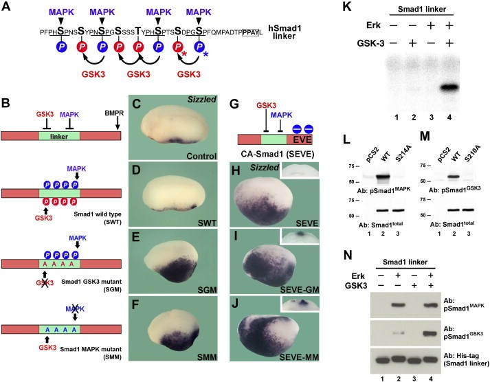 Figure 1. Smad1 Is Phosphorylated and Inhibited by GSK3(A) Smad1 contains MAPK (blue) and GSK3 (red) phosphorylation sites in its linker region. The PPAY binding site of Smurf1 is boxed and serines 210 and 214 used to raise antibodies indicated by asterisks.(B) Smad1 constructs encoding Smad1 wild-type (SWT) or phosphorylation-resistant mutants for GSK3 (SGM) and MAPK (SMM) sites.(CâF) Injection of SGM or SMM, but not of SWT, mRNA increased expression of the ventral marker sizzled in Xenopus embryos.(G) A BMP-independent phospho-mimetic activated Smad1 (SEVE) in which the SVS terminus was mutated into EVE.(HâJ) Activity of SEVE is increased by phosphorylation-resistant linker mutations.(K) GSK3 radioactively phosphorylates Smad1 in vitro, but only when primed by MAPK. The recombinant Smad1 linker substrate was about 90% pure in polyacrylamide gels (data not shown).(L and M) Phospho-specific antibodies for hSmad1 Ser214 (pSmad1MAPK) and Ser210 (pSmad1GSK3 antibody B was used).(N) Phospho-specific antibodies (pSmad1MAPK and pSmad1GSK3-A) demonstrate that GSK3 phosphorylation of recombinant Smad1 requires MAPK priming, in nonradioactive Western blots. Recombinant Smad1 substrate was used in the same amount as in (K).
