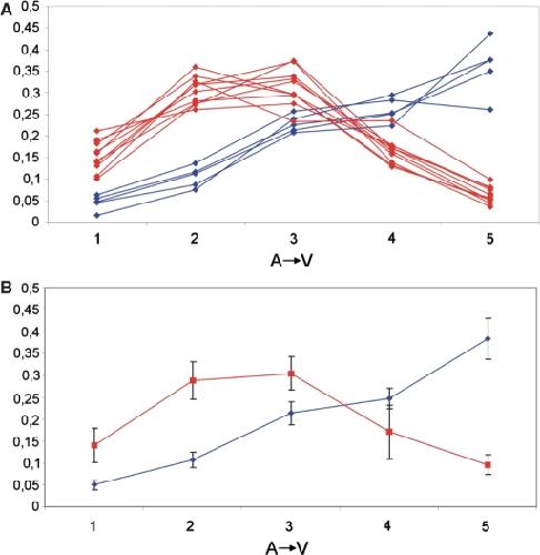 Figure 3. (A) Averaged intracellular mRNA concentration profiles (AâV) for genes studied in at least six eggs. Animal genes (FoxH1, Oct60, GSK-3β, dishevelled, EF-1alpha, Xmam, Tcf-3, GAPDH, β-catenin and XPar-1) are shown in red and vegetal genes (VegT, Vg1, Xdazl, Wnt11 and Otx1) are shown in blue. (B) Average expression profiles of all vegetal (red) and all animal (blue) genes. The error bars indicate 1 SD.
