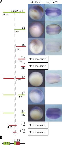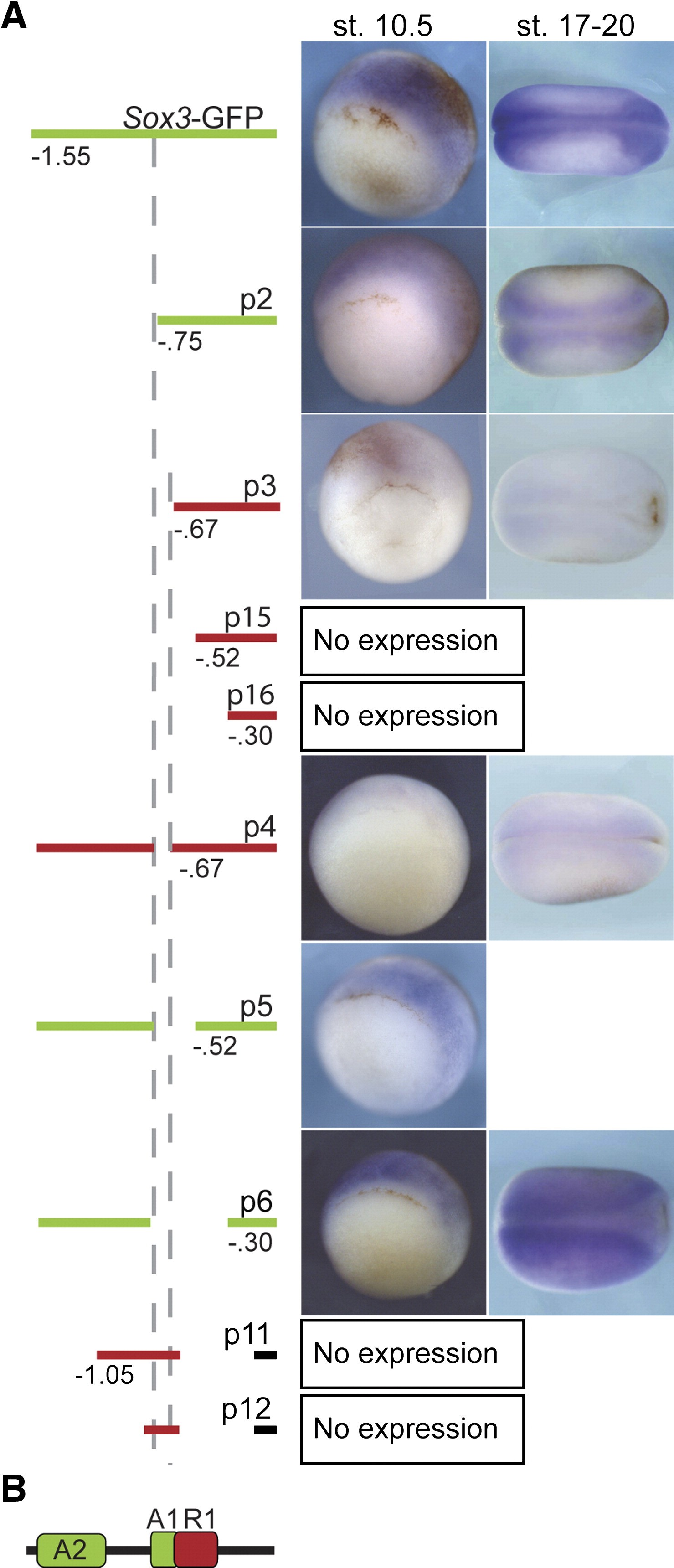 Fig. 5. A 74-bp region is required for expression of sox3-GFP. WISH for GFP expression in gastrula (stage 10.5) and neurula (stage 17â20) transgenic embryos containing sox3-GFP or deletions. (A) Diagrams of 5â² end and internal deletions of the sox3 upstream regulatory region are labeled p1â6, 11, 12, 15 and 16. The region included in the construct is indicated by a bar and deletions by the absence of this bar. A red bar denotes no expression of GFP, while a green bar marks those constructs that drive GFP expression. Numbers indicate the deletion end points with the left dashed vertical line marking 746 bp upstream of the ATG and the right dashed line marking 672 bp upstream. (B) A model summarizing the data. The region between â 672 bp and â 746 bp (green A2, activator 2) is required for expression except when R1 (repressor module) is deleted. In the absence of A2 and R1, a region between â 746 bp and â 1.55 kb (A1) is required for expression. The total numbers of embryos with the expression pattern shown and the relative levels of expression are in Table S1. |