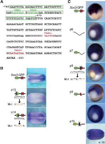 Fig. 6. Identification of transcription factor binding sites required for regulation of sox3-GFP expression. (A) Sequence of regulatory elements and putative transcription factor binding sites. The boxed region is the putative activator module, A2, which is deleted in p4. The remaining sequence is the putative repressor module, R1 which is deleted in p7. The entire region in A plus sequences up to â 299 are deleted in p6. Putative forkhead (FKHD) binding sites are labeled in green and putative Vent1 and Vent2 sites are in red. (B) WISH of transgenic embryos (stage 17â20) expressing sox3-GFP constructs. Embryos are a dorsal view with anterior to the right. A diagram of the upstream regulatory region shown in A is on the left. The numbers in the lower right hand corner refer to the number of embryos with the expression pattern shown over the total number of embryos. (C) WISH of transgenic embryos (stage 12) expressing sox3-GFP constructs. Embryos are a vegetal view with dorsal to the top. An inverted triangle indicates a deletion and an X indicates that a site has been mutated. The total numbers of embryos with the expression pattern shown are in Table 1. Putative TF sites from panel A are represented schematically in the same colors: green circle, Fkhd; red hexagon, Vent1 and Vent2. |