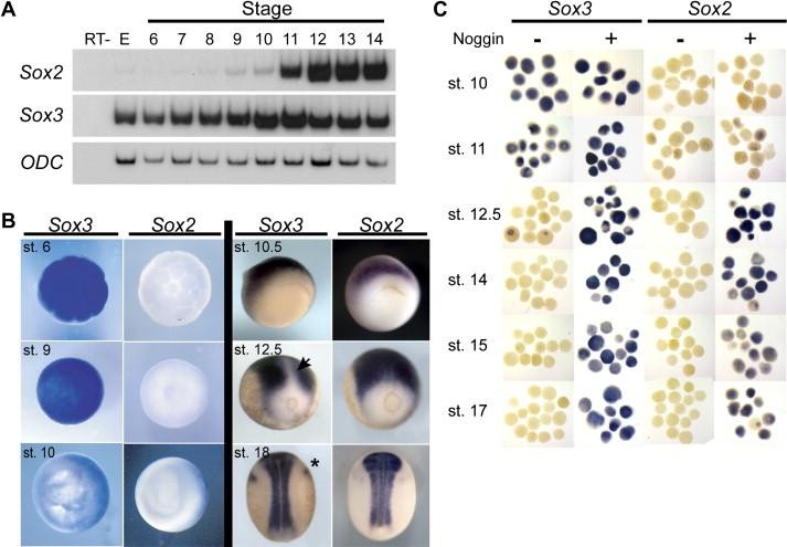 Fig. 1. Comparison of sox3 and sox2 expression in whole embryos and ectodermal explants. (A) Temporal expression of sox3 and sox2 in whole embryos examined by RT-PCR. ODC is used as a loading control. RTâ is no reverse transcriptase and E is egg. (B) WISH analysis of sox3 and sox2 expression in cleavage (stage 6), blastula (stage 9), gastrula (stage 10â12.5) and neurula (stage 18) embryos. Stage 6â10 embryos are viewed from the animal pole with dorsal to the right, stage 10.5 and 12.5 embryos from the vegetal pole with dorsal to the top, and stage 18 embryos from dorsal side with anterior to the top. The arrowhead and asterisk mark the midline and otic placode, respectively. (C) Expression of sox3 and sox2 in animal ectodermal explants isolated from uninjected embryos and embryos injected with noggin mRNA (indicated by +). |
