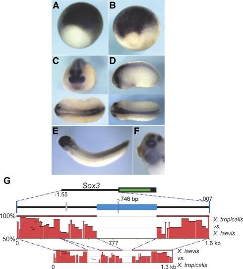Fig. 4. A 1.55 kb Xlsox3 upstream regulatory region is partially conserved in X. tropicalis and mimics endogenous sox3 expression (AâF) WISH of transgenic embryos expressing the Xlsox3-GFP reporter construct. (A) Vegetal view of a stage 10.5 and (B) stage 12 embryo with dorsal to the top. (C) Anterior view of a stage 21 embryo on top with a dorsal view of the same embryo directly below. (D) Lateral view of a stage 24 embryo with a dorsal view of the same embryo directly below. (E) Dorsal view of a stage 27 embryo. (F) Lateral view of the head of a stage 33 embryo. The line represents the sox3 upstream regulatory region and â 1.55 represents the distance in kb from the ATG. The green box represents the EGFP coding region and the black box the SV40 polyA region. (G) Evolutionary conserved regions between X. laevis and X. tropicalis sox3. A diagram of the sox3 regulatory region used in panels AâF is at the top with a percent identity plot (pip) of Xlsox3 aligned to a homologous region of Xtsox3 below it. At the bottom is a pip of Xtsox3 aligned to Xlsox3. The blue box represents a 484-bp region in X. laevis which does not align to the Xtsox3 sequence. The gray box represents a 30-bp region which is conserved between mouse and Xlsox3. The X-axis of the pip is the length of the sequence in bases or kilobases as designated. The Y-axis spans 50â100% nucleotide identify with the light horizontal line in the center representing 75% nucleotide identity. The red regions under the curve represent evolutionary conserved blocks. Two large blocks of the Xlsox3 upstream regulatory region align with Xtsox3. In Xtsox3, the first block (farthest from the ATG) is split into two blocks. |