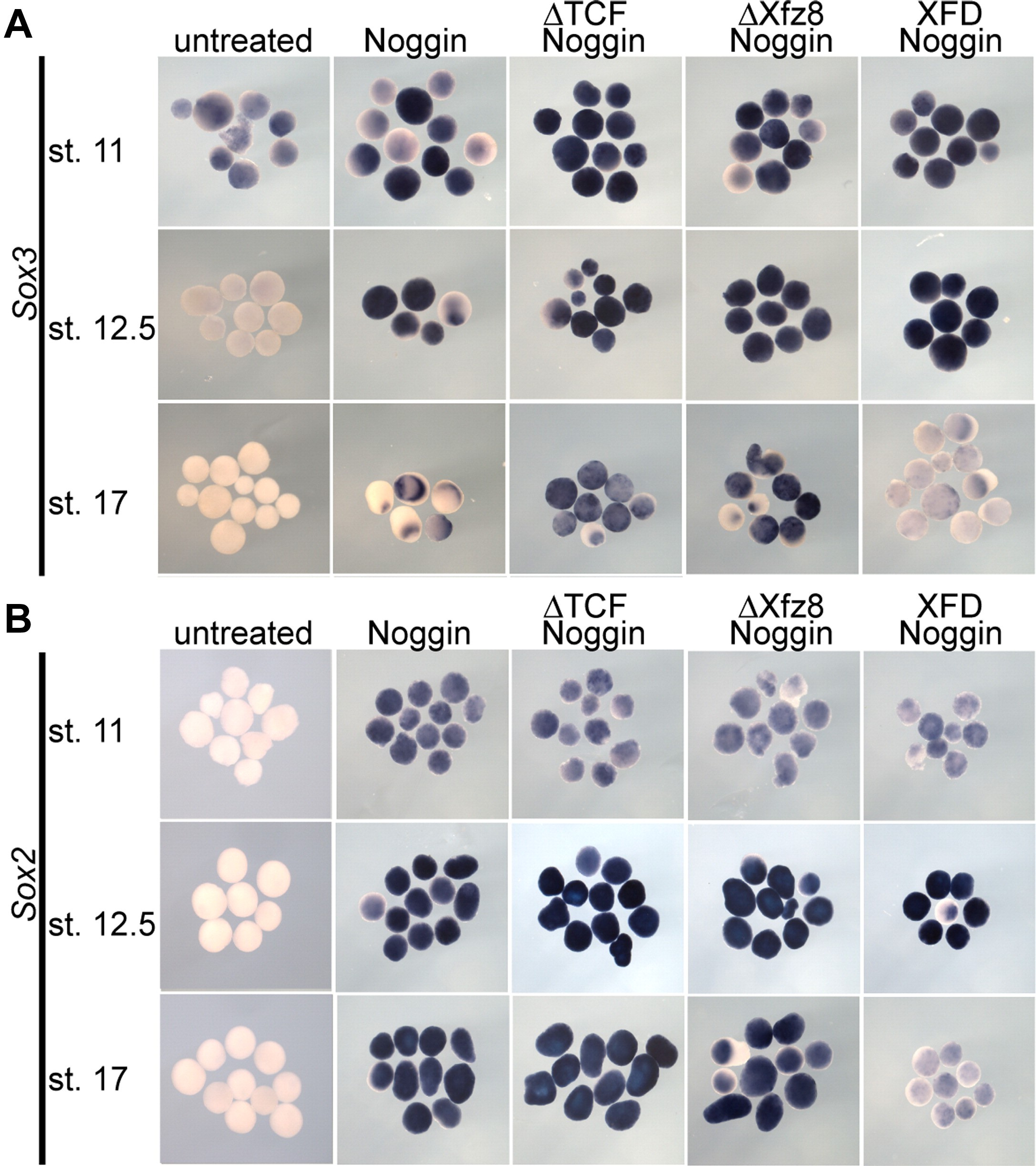 Fig. 2. FGF is required for the maintenance but not the induction of sox2 and sox3 expression in ectodermal explants. Expression of (A) sox3 and (B) sox2 in animal ectodermal explants as revealed by WISH. Explants were excised between stages 8 and 9 from untreated embryos or those injected at the 1-cell stage with mRNA for noggin alone, noggin plus δTCF3, noggin plus δXfz8 or noggin plus XFD mRNA. Explants were cultured until early gastrula (stage 10.5/11), late gastrula (stage 12.5) or neurula (stage 17) stage as determined by whole embryo controls. |