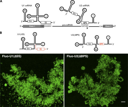 In amphibian oocytes, most lateral loops of the lampbrush chromosomes correspond to active transcriptional sites for RNA polymerase II. We show that newly assembled small nuclear ribonucleoprotein (RNP [snRNP]) particles, which are formed upon cytoplasmic injection of fluorescently labeled spliceosomal small nuclear RNAs (snRNAs), target the nascent transcripts of the chromosomal loops. With this new targeting assay, we demonstrate that nonfunctional forms of U1 and U2 snRNAs still associate with the active transcriptional units. In particular, we find that their association with nascent RNP fibrils is independent of their base pairing with pre-messenger RNAs. Additionally, stem loop I of the U1 snRNA is identified as a discrete domain that is both necessary and sufficient for association with nascent transcripts. Finally, in oocytes deficient in splicing, the recruitment of U1, U4, and U5 snRNPs to transcriptional units is not affected. Collectively, these data indicate that the recruitment of snRNPs to nascent transcripts and the assembly of the spliceosome are uncoupled events.