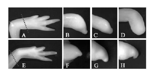 Figure 1. Effect of pifithrin-α on limb regeneration. (A & E) Controls treated daily with DMSO. (B-D & F-G) Pifithrin-α treated animals (5 μM pifithrin-α, added freshly diluted everyday). Limbs in panels A-D were amputated distally in the middle of the zeugopod and limbs in panels E-G were amputated proximally through the middle of the stylopod (see dotted lines in panels A & E for amputation levels).