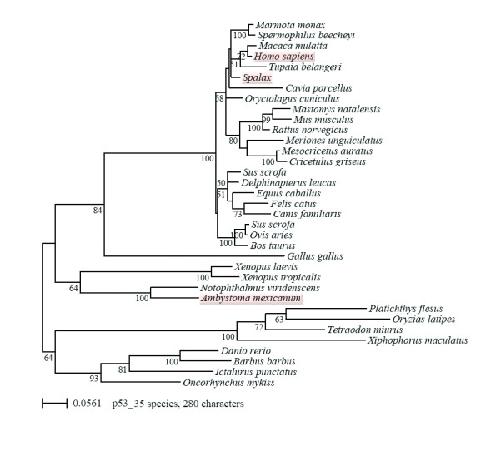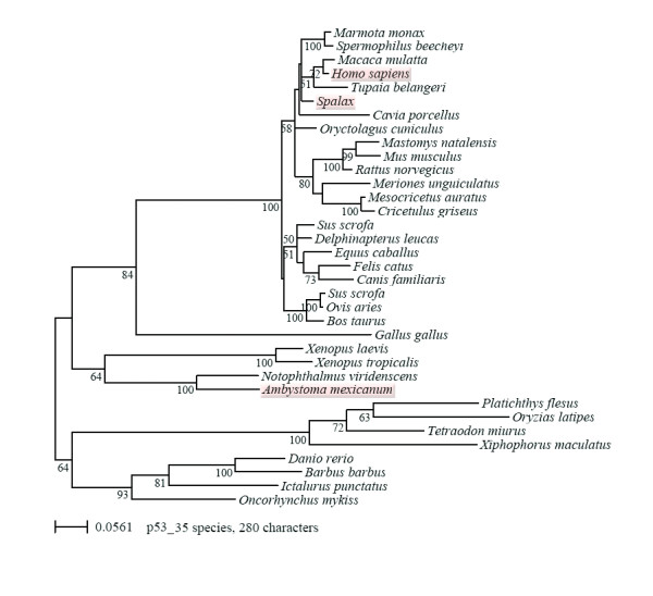 Figure 3. Phylogenetic tree of p53 protein sequences in vertebrates with bootstrap values. Maximum likelihood phylogenetic tree based on 35 p53 sequences with 280 amino acid positions inferred by the program Treefinder with a WAG+Γ8 model. Numbers at internal nodes are corresponding to bootstrap support values, obtained in the analysis of 100 replicates using the same program and model of sequence evolution. Due to the dense species sampling within the mammals interesting aspects of mammalian evolution are becoming apparent. There are clear differences in the evolutionary rates among the different groups, indicated by the branch length of the rooted tree, this is especially true for the four Neoteleost fish. There is also an acceleration observed for the mouse-like rodents, with a striking exception represented by the sequence of the mole rat Spalax, which is despite the fact of being a rather small rodent even more slowly evolving than the related rabbit (Oryctolagus, lagomorph). In fact the only sequences among the tetrapods (amphibians, reptilian and mammalian) that are more slowly evolving than the one from Spalax are from the urodeles (axolotl and newts). The primary sequence of salamander p53 is more closely related to the ancestral protein of tetrapod vertebrates than the p53 proteins of any other of the studied groups.