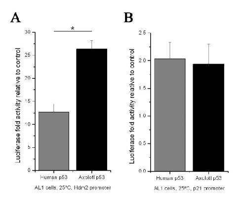 Figure 6. Activation of Hdm2 and p21 promoters by human and axolotl p53 in AL1 cells. (A-B) Dual-luciferase assays in AL1 cells with Hdm2 and p21 promoters at 25°C. All Luciferase activities were significantly different from non-p53 controls (at least p < 0.05, data not shown). Error bar ± s.e.m. human and axolotl p53 induced luciferase expression were significantly different with the Hdm2 promoter (p < 0.01). Each assay was performed in triplicate at least 3 separate times.