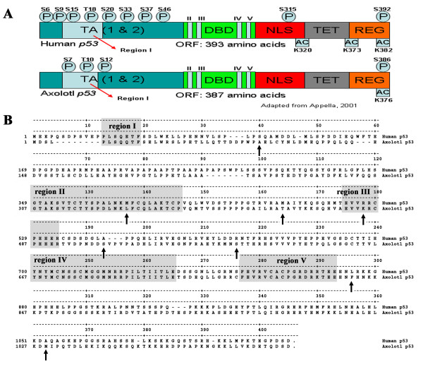 Figure 2. Comparison between Human and axolotl p53 important domains, regions and residues. (A) Schematic structure of p53 protein (adapted from Appella, 2001 [71]): TA, Transactivation Domain; DBD, DNA Binding Domain; NLS, Nuclear Localisation Signal; TET, tetramerisation domain; REG, Regulatory domain; Regions I-V, highly conserved regions. Lysine (K), serine (S) and threonine (T) residues implicated in post-translational modifications are indicated. The protein domains depicted in the diagrams are not to scale. (B) Sequences alignment of human and axolotl p53 proteins. The conserved regions I to V are highlighted and many changes between the axolotl and human sequence are identified (arrows). See table-2 for a complete list of changes associated with mutations in the human protein.