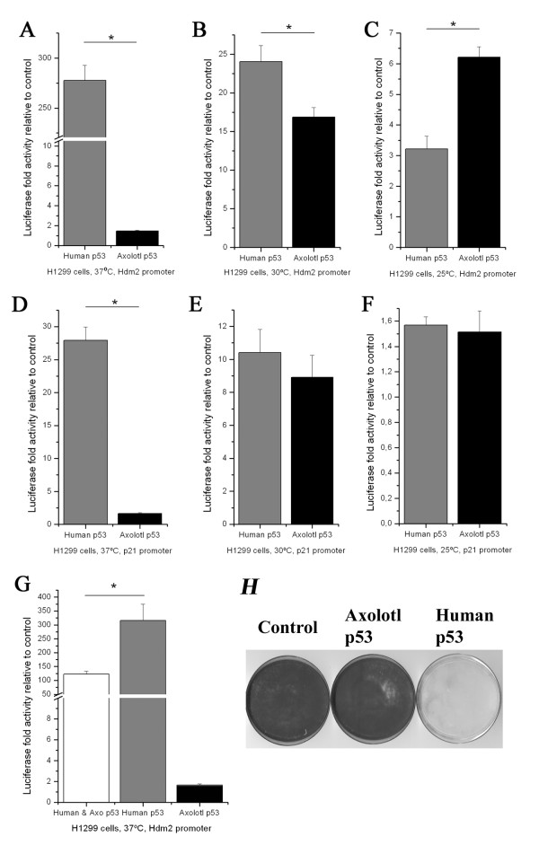 Figure 4. Activation of Hdm2 and p21 promoters by human and axolotl p53 in H1299 cells. (A-C) Dual-luciferase assays in H1299 cells with Hdm2 promoter at 37°C, 30°C and 25°C. (D-F) Dual-luciferase assays in H1299 cells with the human p21 promoter at 37°C, 30°C and 25°C. Luciferase activities stimulated by human or axolotl p53 was significantly different than non-p53 controls (at least p < 0.05, data not shown). Error bars are ± s.e.m. human and axolotl p53 luciferase transactivation were significantly different during the same assay using the Hdm2 promoter (A-C) or the human p21 promoter at 37°C (D) (at least p < 0.01). Each assay was performed in triplicate at least 3 separate times. (G) Inhibition of the activation of Hdm2 promoter by the combined expression of human and axolotl p53 in H1299 cells. All luciferase activities were significantly different than non-p53 controls (at least p < 0.05, data not shown). Error bars are ± s.e.m. human + axolotl and human p53 luciferase transactivation were significantly different during the same assay using the Hdm2 promoter at 37°C (p = 0.006). Each assay was performed in triplicate. (H) Growth assays at 37°C on H1299 cells transfected with human or axolotl p53 protein.