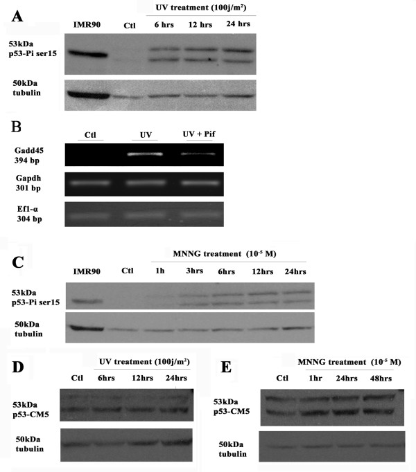Figure 7. Detection of p53 protein in AL1 cells. (A & C) Western blot analysis of phospho-ser15 p53 in AL1 cells exposed to UV or treated with MNNG. (B) RT-PCR analysis of p53 target gene, Gadd45 (a p53 target gene cloned in axolotl [57, 58]), in control treated axolotl AL1 cells, cells exposed to UV (6h post-irradiation) and cells exposed to UV & treated with pifithrin-α. Both Gapdh and Ef1α were used as controls to demonstrate that the effects of UV and UV plus pifithrin-α were specific for Gadd45. (D-E) Western blot analysis of total p53 protein (CM5 antibody) on AL1 cells exposed to UV or treated with MNNG.
