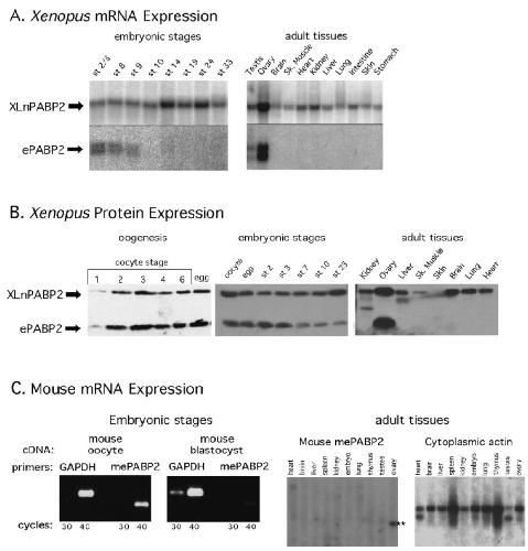 FIG. 3. Xenopus ePABP2 is expressed during oogenesis, in early embryos and in adult ovary tissue. A: Total RNA was isolated from Xenopus embryos at the indicated stages of development (the blot on the left) and various adult tissues (the blot on the right), fractionated by denaturing agarose gel electrophoresis and transferred to filters. Each filter was hybridized with a radiolabeled probe to detect mRNA encoding the Xenopus nuclear PABP2 (the upper panels, 1015 nucleotides). The filters were stripped and reprobed to detect Xenopus ePABP2 mRNA (the lower panels, 1260 nucleotides). B: Total protein was isolated from Xenopus oocytes at the indicated stages (blot on the left), embryos at the indicated stages of development (the blot in the middle), and various adult tissues (the blot on the right), fractionated by SDS polyacrylamide gel electrophoresis and transferred to filters. Five cells worth of protein were analyzed for the stage I, II, and III oocytes, whereas a single cells worth of protein was analyzed for stage IV and VI oocytes. Each filter was probed with the polyclonal -PABP2 antibodies to detect both Xenopus nuclear PABP2 and ePABP2. C: Mouse ePABP2 is expressed in early embryos and ovary tissue. cDNA generated from RNA isolated from mouse oocytes and blastocyst stage embryos was used as the template for PCR with primers for the ubiquitously expressed GAPHD mRNA or mouse ePABP2 mRNA (mePABP2). Both primer sets span one or more introns of the genomic sequence. Amplification was done for 30 and 40 cycles and the products analyzed by agarose gel electrophoresis. mRNA from the mouse tissues indicated was analyzed using RNA filter hybridization and a probe for mouse ePABP2 (the blot on the left, 1100 nucleotides). The same filter was stripped and reprobed for mouse cytoskeletal actin mRNA (the blot on the right). Mouse ePABP2 mRNA is expressed in ovarian tissue (**) but not other adult mouse tissues. Reproduced with permission of the Publisher, John Wiley & Sons.