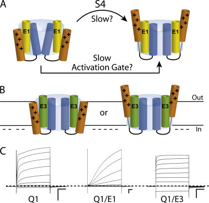 Figure 1. Cartoon models depicting possible mechanisms for KCNE1 and KCNE3 modulation of KCNQ1 channels (A) In Q1/E1 channel complexes, slow gating arises from either the slow transition of S4 voltage-sensing domains (orange with positive charges) from resting to active positions, or from slow activation gate opening. (B) Q1/E3 complexes are open at hyperpolarizing potentials (denoted by negative charges along the cytoplasmic membrane) because S4 voltage sensors are uncoupled from the opening of the gate (left), or because the equilibrium of voltage sensors is shifted to favor the activated state (right). (C) TEVC recordings of Q1 channels alone and partnered with E1 and E3 peptides in ND96 solution (Materials and methods). Oocytes were held at −80 mV, and currents were elicited from 4-s command voltages from −100 mV to +40 mV in 20-mV increments. Scale bars represent 0.5 μA and 0.5 s. Dashed line indicates zero current.