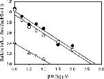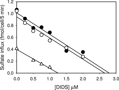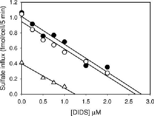 Figure 3. DIDS titration of sulfate transport. The influx of [35S]sulfate into the cells was measured at 10% hematocrit in isotonic citrate buffer (84 mM sodium citrate, 1 mM EGTA, 4 mM sodium sulfate [pH 6.5]). Influx was determined after 5 minutes at 30°C in the presence of different concentrations of DIDS. The lines show the results of linear regression analysis of the data. ● indicates control; ○, mother; and ▵, patient. |