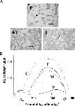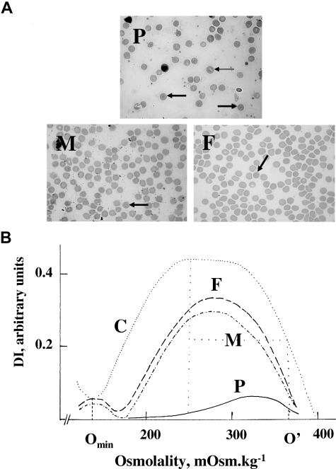 Figure 1. Blood smears and osmotic gradient ektacytometry. Blood smears (A) and osmotic gradient ektacytometry (B). (A) P indicates proband. Many red blood cells were spherocytes (➡). The remaining showed further changes, as if some fragmentation had occurred. There was a pronounced anisocytosis. A few red cells verged on stomatocytes (→). Erythroblasts were present (17%). F indicates father. Presence of many spherocytes without anisocytosis. M indicates mother. Presence of many spherocytes without anisocytosis. (B) In both parents (M and F), there was an increased osmotic fragility, a reduced maximum deformability index, and a decreased dehydration, a situation typical of HS.11 These features were dramatically enhanced in the proband (P). C indicates control. The maximum deformability index (DImax; normal values, 0.41-0.53 AU) is the maximum value of the deformability index. The “hypo-osmotic point” (Omin; normal values, 143-163 mOsm/L) is the osmolality at which the deformability index reaches a minimum in the hypotonic region; it is the same as the osmolality at which 50% of the erythrocytes hemolyze in a standard osmotic resistance test. This index thus provides a measure of the average surface area–to-volume ratio of erythrocytes. The “hyper-osmotic point” (O′; normal values, 325-375 mOsm/L) is the osmolality in the hypertonic region (right leg of the curve) at which the deformability index reaches half its maximum value. It provides information on the erythrocyte hydration. |