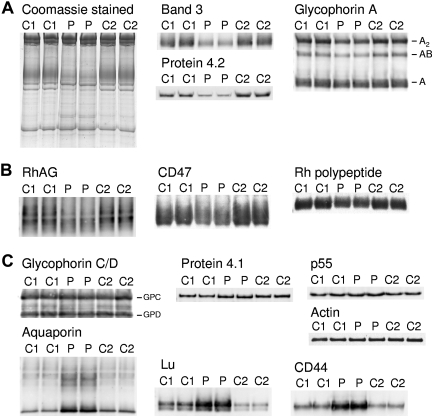 Figure 2. Coomassie and immunostaining of erythrocyte membrane proteins. Erythrocyte membranes were separated on 10% Laemmli gels and immunoblotted using antibodies as shown. Loading C1, C2, controls 1 and 2, respectively. P indicates proband. (A) Proteins of the band 3 complex: immunoblotting used the monoclonal antibody BRIC170 (N-terminal band 3) and antipeptide antibodies against C-terminal of protein 4.2 and GPA. (B) Proteins of the Rh complex: immunoblotting used antipeptide antibodies against C-terminal of RhAG, Rh polypeptides, and CD47. (C) Proteins of the glycophorin C (GPC) complex: immunoblotting used antipeptide antibodies against C-terminal of GPC and GPD, protein 4.1, and p55. Other proteins: immunoblotting used monoclonal antibodies anti–β-actin (Abcam), BRIC235 (CD44), and BRIC221 (Lu), and an antipeptide antibody against C-terminal aquaporin (AQP1). All antibodies used as described in “Erythrocyte membrane protein analysis.” |