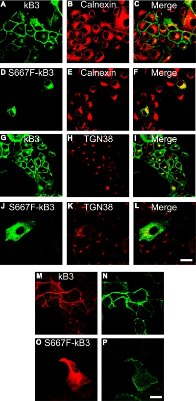 Figure 5. Expression of S667F-kB3 in nonpolarized MDCK1 cells. (A-P) MDCK1 cells stably expressing normal kB3 or mutant S667F-kB3 that were grown on coverslips and fixed (A-L), or washed, incubated with the extracellular anti–band 3 antibody BRIC6 for 1 hour, and then fixed (M-P) as outlined in “Methods.” (A-L) Comparison of kB3 and S667F-kB3 localization with intracellular markers for the ER (calnexin) or TGN (TGN38). kB3 had only a partial overlap with the ER marker (merge; panel C) and some overlap with TGN38 (merge; panel I); most of the protein is at plasma membrane as previously reported.16 The majority of mutant S667F-kB3 immunoreactive protein overlapped with the calnexin (merge; panel F), but there was some overlap with the TGN38 staining (merge; panel L), suggesting that a small proportion of the protein reaches the late stages of the secretory pathway. (M-P) rbB3Ct staining (M,O) and BRIC6 staining (N,P). All cells expressing wild-type kB3 (confirmed by double staining with the rbB3Ct: panel M) are labeled with substantial amount of FITC-BRIC6 (N). Cells expressing S667F-kB3, which were detected with the rbB3Ct antibody (O), also bound a small amount of FITC-BRIC6 (P), suggesting that a small amount of S667F-kB3 can reach the plasma membrane. Scale bar equals 30 μm. |