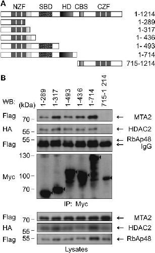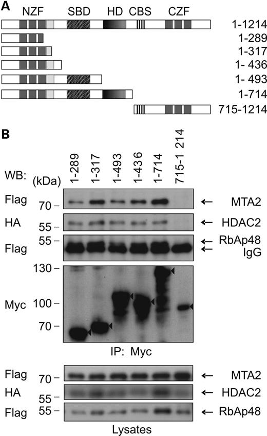 Figure 4. Zfhx1b associates with NuRD via its N-terminal domain. (A) Graphic presentation of wild-type (WT) full-length (FL) and mutant Zfhx1b proteins used in this study. (B) Western-blot detection showing co-immunoprecipitation of Flag-MTA2 and RbAp48, and HA-HDAC2 with the respective Zfhx1b proteins (triangle) tested.