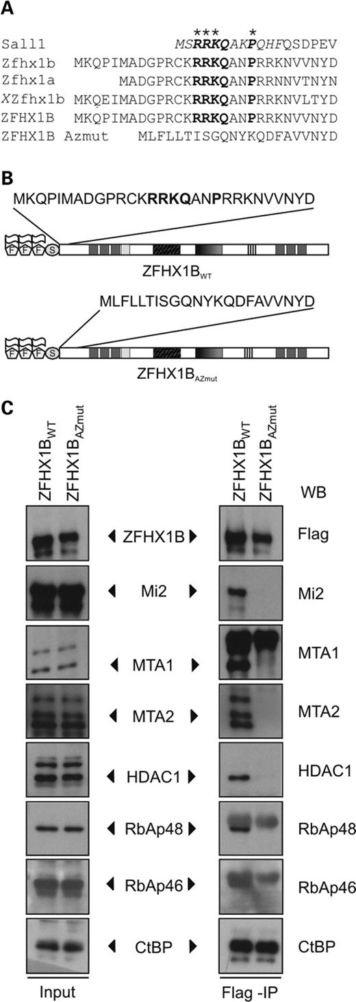 Figure 5. Defective NuRD recruitment by a mutant ZFHX1B protein that causes atypical MWS. (A) Alignment of Sall1, Zfhx1a, mouse, Xenopus laevis and human wild-type Zfhx1b, and mutant ZFHX1B amino-terminal domains. The conserved 12 amino acid motif (italics) in Sall1 that is sufficient for NuRD recruitment and the critical residues (*) that abolished binding to NuRD and repression by Sall1 when mutated are indicated. Note that mouse Zfhx1a and mouse, human and Xenopus laevis Zfhx1B but not the Atypical Zweier mutant human Zfhx1b contain the conserved motif (bold) within their N-terminus. (B) Schematic presentation of the ZFHX1BWT and ZFHX1BAZmut proteins used in this study. (C) Western-blot detection showing co-immunoprecipitation of endogenous NuRD subunits with ZFHX1BWT but not ZFHX1BAZmut. Note that CtBP binding by ZFHX1BAZmut proteins is unaffected.