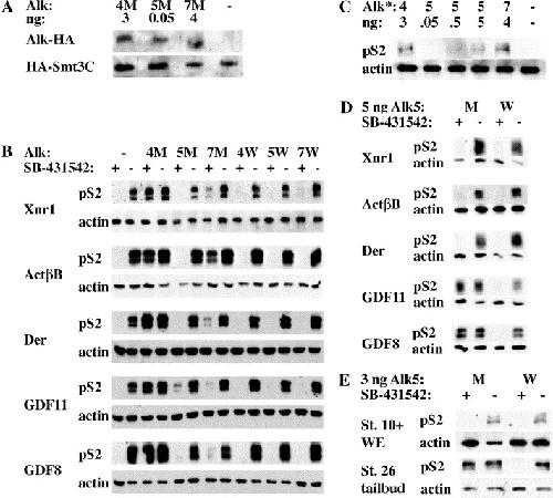 Fig. 8. Alk4, Alk5, and Alk7 mediate signaling by different subsets of activin/nodal ligands (A) Embryos were injected with 3 ng Alk4-HA SM (4M), 50 pg Alk5-HA SM (5M), or 4 ng Alk7-SM (7M) along with 500 pg HA-Smt3C as an internal loading control. α-HA IP-Westerns were performed on stage 10.5 embryos. (B) Embryos were injected with 1 ng Xnr1, 20 pg ActβB, 2 ng Derrière, 2 ng cDsl-hGDF11, or 2 ng cDsl-mGDF8 along with 3 ng xAlk4-HA S275M (4M) or WT (4W), 50 pg rAlk5-HA S278M (5M) or WT (5W), or 4 ng rAlk7-HA S270M (7M) or WT (7W). Animal caps were incubated in 100 μM SB-431542 or DMSO until stages 10â10.5, and subsequently harvested for Western blots against p-Smad2. (C) Constitutively active Alks (Alk4*, Alk5*, and Alk7*) were injected at various doses and pSmad2 signaling was assessed in animal caps. (D) 5 ng of rAlk5-HA S278M or rAlk5-HA WT were coinjected with the same concentrations of ligands used in panel A and p-Smad2 signaling was assayed in SB-431542 or DMSO-treated animal caps. (E) Xenopus embryos were injected with 3 ng Alk5-HA S278M or WT. Embryos were treated with 100 μM SB-431542 at stage 6 and harvested at stage 10+, or treated at stage 14 and harvested (tailbud region only) at stage 26. For all experiments, actin was used as a loading control.