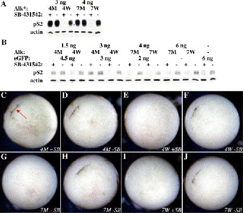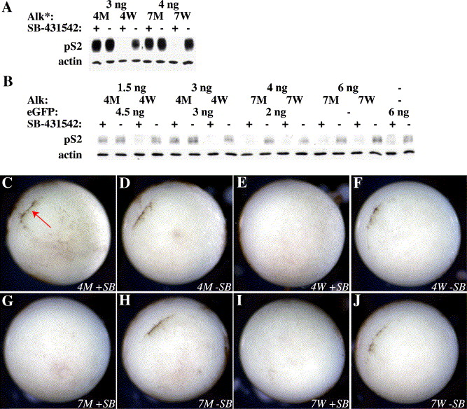 Fig. 9. Alk4 but not Alk7 can rescue signaling during gastrulation (A) Alk4* and Alk7*-injected animal caps were treated with 100 μM SB-431542 and p-Smad2 signaling was assessed by Western blot at stage 10.5. (B) Embryos injected with different amounts of xAlk4-HA or rAlk7-HA were treated with 100 μM SB-431542 at stage 6 and harvested for Western blotting at stage 10+. All mRNA levels were equalized to 6 ng total with eGFP. Embryos injected with (C, D) 3 ng xAlk4-HA S275M, (E, F) 3 ng xAlk4-HA WT, (G, H) 4 ng rAlk7-HA S270M, or (I, J) 4 ng rAlk7-HA WT were treated as above and photographed at stage 10+. Note rescue of blastopore lip formation in Alk4 S275M embryo (red arrow in panel B). Embryos are photographed with the vegetal pole showing, dorsal to the upper left.