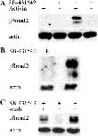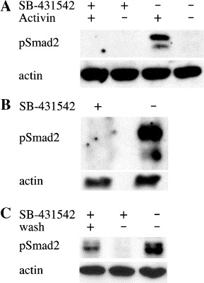 Fig. 1. SB-431542 reversibly blocks phospho-Smad2 in Xenopus animal cap explants and zebrafish embryos. Western blots for p-Smad2 were performed on (A) Xenopus animal caps treated with 100 μM SB-431542 or DMSO followed by 0.3 nM soluble activin protein, (B) 50% epiboly zebrafish embryos treated with 100 μM SB-431542 or DMSO at 16-cell stage, and (C) tails from stage 34 embryos treated with 100 μM SB-431542 or DMSO at stage 19 for 24 h and either washed (lane 1) or unwashed (lanes 2 and 3) for 16 h. Cytoskeletal actin was used as a loading control.