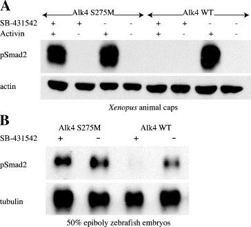 Fig. 4. Alk4 S275M restores phospho-Smad2 signaling to SB-431542-treated animal caps and embryos. Embryos (Xenopus and zebrafish) were injected with 100 pg Alk4 S275M or 100 pg Alk4 WT. Western blots for phospho-Smad2 were performed on (A) stage 8.5 Xenopus animal caps treated with 100 μM SB-431542 or DMSO followed by 2 nM soluble activin protein, and (B) 50% epiboly zebrafish embryos treated with 100 μM SB-431542 at 16-cell stage. Cytoskeletal actin and tubulin were used as loading controls for panels A and B, respectively.