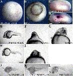 Fig. 2. SB-431542 induces morphological defects in embryos. (AâB) Xenopus embryos were treated with SB-431542 (A) or DMSO (B) at stage 3 and allowed to develop until stage 11. Note failure of blastopore lip formation in the treated embryo. (CâD) Xenopus embryos were treated with SB-431542 (C) or DMSO (D) at stage 13 and fixed for in situ hybridization with an xAntivin antisense probe at stage 22. Embryos are photographed with anterior to the left and the left side showing. Note loss of left-sided xAntivin expression (red arrow in panel D) in the treated embryo. (EâI) Zebrafish embryos were treated with 100 μM SB-431542 or DMSO at 16-cell stage and examined at 24 hpf. (E) SB-431542-treated embryo, displaying head and midline defects, fewer and more posteriorsomites, and poor yolk extension morphology. (F) Close-up of head region of SB-431542-treated embryo with âsevereâ phenotype. (G) Close-up of head region of SB-431542-treated embryo with âmoderateâ phenotype. (H) DMSO-treated control embryo. (I) Close-up of head region of control embryo. (JâL) Embryos treated at 16-cell (J) have more severe loss of head and axial structures (arrows) than those treated at 256-cell (K), although both are significantly perturbed compared to controls (L).