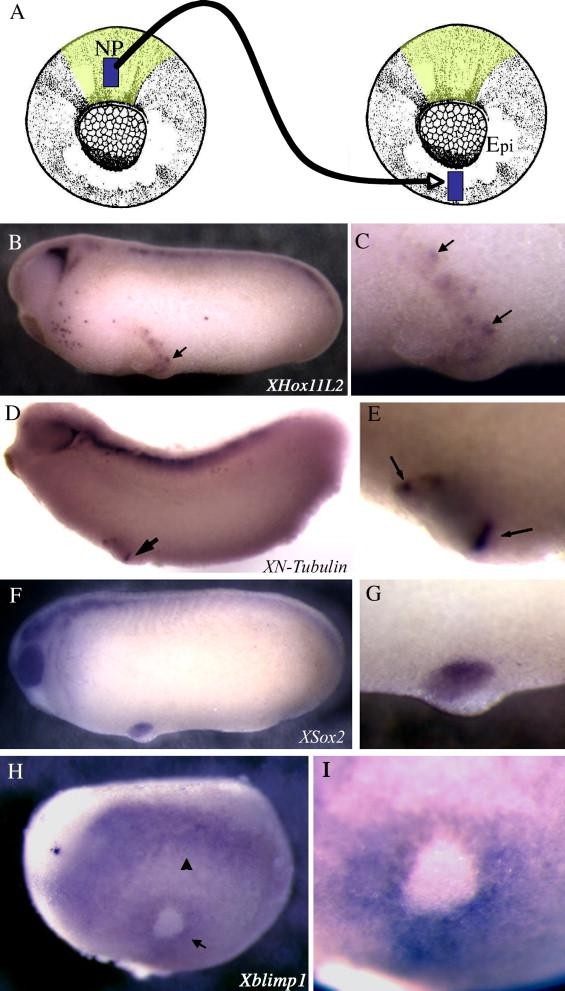 Fig. 2. Contact between neural plate and non-neural ectoderm induces RB sensory neurons. (A) Schematic of transplantation experiment. Intermediate neural plate tissue was transplanted into the ventral or ventrolateral non-neural ectoderm of same-stage embryos and allowed to develop until stages 14â28 (schematic of embryo described in Fig. 1; modified from Nieuwkoop and Faber, 1994). (BâI) In situ hybridization of embryos after transplantation of intermediate neural plate into non-neural ectoderm, lateral views, anterior to the left at 3.2à (B, D, F, H) or 6.6à (C, E, G, I). Endogenous gene expression is observed in all embryos dorsally (toward the top). (B, C) Several XHox11L2-positive RB sensory neurons were found surrounding the transplant site in a stage 26 embryo (arrows). The staining in these cells looks morphologically similar to the staining of endogenous RBs. (D, E) XN-tubulin-positive cells in a stage 27â28 embryo surround transplanted tissue. (F, G) XSox2 expression in the transplanted region indicating grafted tissue maintains its neural identity. (H, I) Xblimp1 positive cells were observed both at the region spanning the neural plate border (arrowhead) and at the site of the transplant (arrow). NP = neural plate; Epi = epidermal ectoderm.
