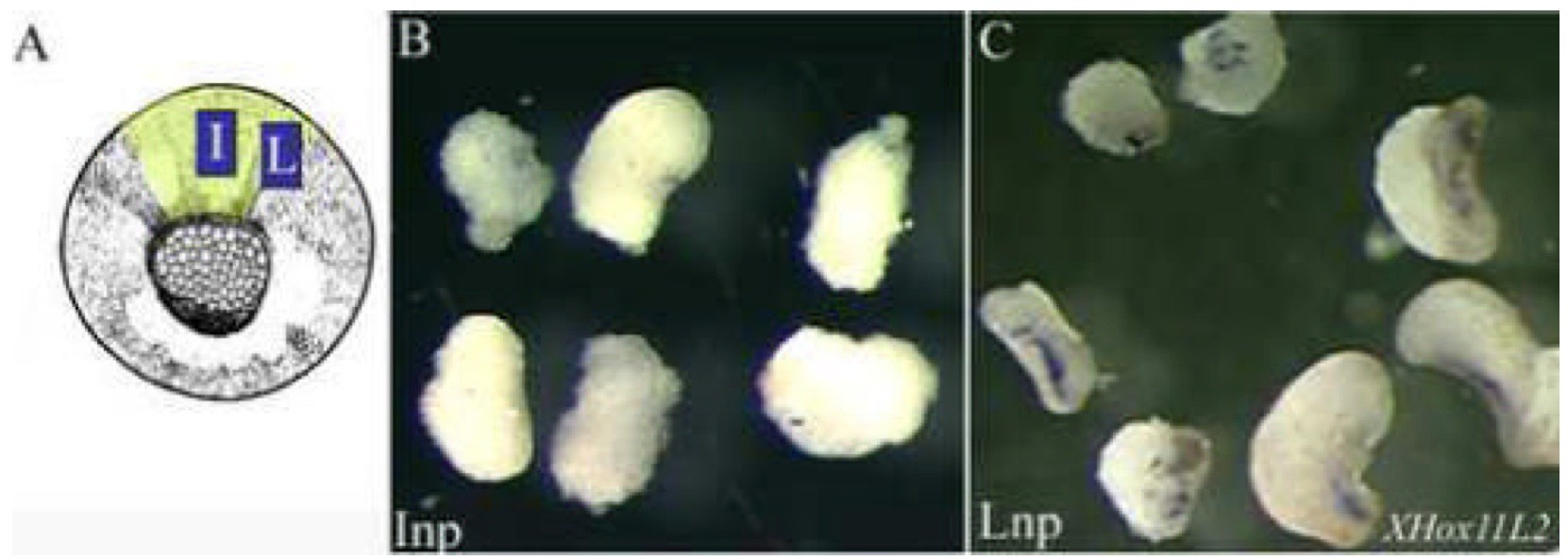 (A) Schematic diagram of stage 11.5 Xenopus laevis embryo, vegetal view with the neural plate shaded in yellow, showing the region from which intermediate ( and lateral ( neural plate explants were taken to determine the competence of these tissues. (B, C) Intermediate (np and lateral (np neural plate explants were taken from stage 11.5â12 embryos and allowed to develop until stage-matched intact embryos reached stage 24â25. Intermediate neural plate explants stained negative for XHox11L2 expression (B), while lateral neural plate explants stained positive (C). (A) Modified from Nieuwkoop and Faber, 1994.