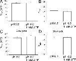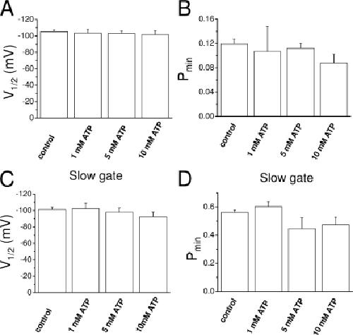 Figure 3. Statistical evaluation of the gating parameters V1/2 and Pmin at pH 7.3 obtained in control solution (n = 10) and in solutions containing 1 (n = 3), 5 (n = 5), or 10 mM ATP (n = 5). Mean values of V1/2 (A) and Pmin (B) obtained from the analysis of the overall gating mechanism of hClC-1. Mean values of V1/2 (C) and Pmin (D) obtained from the analysis of isolated slow gating mechanism of hClC-1. The values are not significantly different (P > 0.06 using Student's unpaired t test).