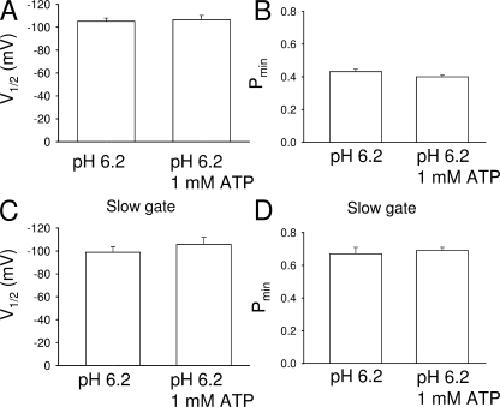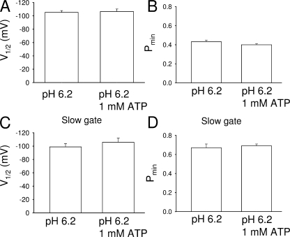 Figure 5. Statistical evaluation of the gating parameters V1/2 and Pmin obtained with internal solution at pH 6.2 without ATP and with 1 mM ATP. Mean values of V1/2 in the absence and in the presence of 1 mM ATP (n = 36 and n = 21, respectively) (A) and Pmin (n = 28 and n = 9, respectively) (B) obtained from the analysis of the overall gating mechanism of hClC-1. Mean values of V1/2 in the absence and in the presence of 1 mM ATP (n = 8 and n = 5, respectively) (C) and Pmin (n = 19 and n = 13, respectively) (D) obtained from the analysis of isolated slow gating mechanism of hClC-1. The values in the absence and in the presence of 1 mM ATP are not significantly different (P > 0.06 using Student's unpaired t test).
