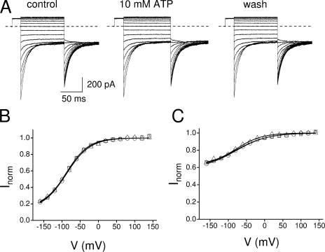 Figure 2. Effect of ATP on the gating of hClC-1. (A) macroscopic current recordings from an inside-out patch upon perfusion with control internal solution (left), during application of 10 mM ATP (middle), and after washout (right). (B) Voltage dependence of the overall open probability obtained from the macroscopic currents in A as described in Materials and methods. Symbols are: square, control; circle, 10 mM ATP; triangle, wash. Lines are fits of Eq. 1 with the following parameters: control, V1/2 = −89 mV, Pmin = 0.14; 10 mM ATP, V1/2 = −88 mV, Pmin = 0.13; wash V1/2 = −87 mV, Pmin = 0.14. (C) Effect of ATP on the slow gating mechanism of hClC-1. Data are from the same patch and were obtained from tail currents preceded by a 200-μs pulse to 160 mV. Symbols are as in B. Lines are fits of Eq. 1 with the following parameters: control, V1/2 = −82 mV, Pmin = 0.59; 10 mM ATP, V1/2 = −81 mV, Pmin = 0.58; wash V1/2 = −78 mV, Pmin = 0.63.