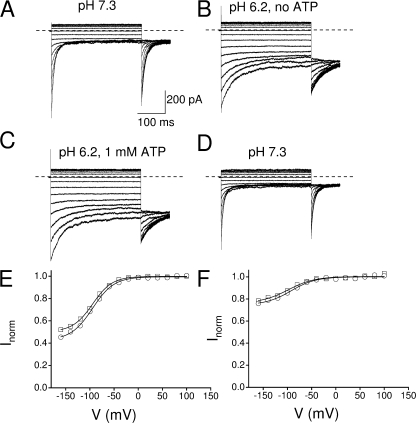 Figure 4. Effect of ATP on the gating of hClC-1 at pH 6.2. Top panel, macroscopic current recordings from an inside-out patch upon perfusion with control internal solution at pH 7.3 (A), pH 6.2 (B), solution at pH 6.2 with 1 mM ATP (C), and after washout (D). (E) Voltage dependence of the overall open probability obtained from the macroscopic currents in the top panel as described in Materials and methods. Symbols are: square, internal solution at pH 6.2; circle, solution at pH 6.2 with 1 mM ATP. Lines are fits of Eq. 1 with the following parameters: solution at pH 6.2, V1/2 = −94 mV, Pmin = 0.50; solution at pH 6.2 with 1 mM ATP, V1/2 = −95 mV, Pmin = 0.43. (F) Effect of ATP at pH 6.2 on the slow gating mechanism of hClC-1. Data are from the same patch and were obtained from tail currents preceded by a 200-μs pulse to 160 mV. Symbols are as in E. Lines are fits of Eq. 1 with the following parameters: solution at pH 6.2, V1/2 = −98 mV, Pmin = 0.74; solution at pH 6.2 with 1 mM ATP, V1/2 = −93 mV, Pmin = 0.74.